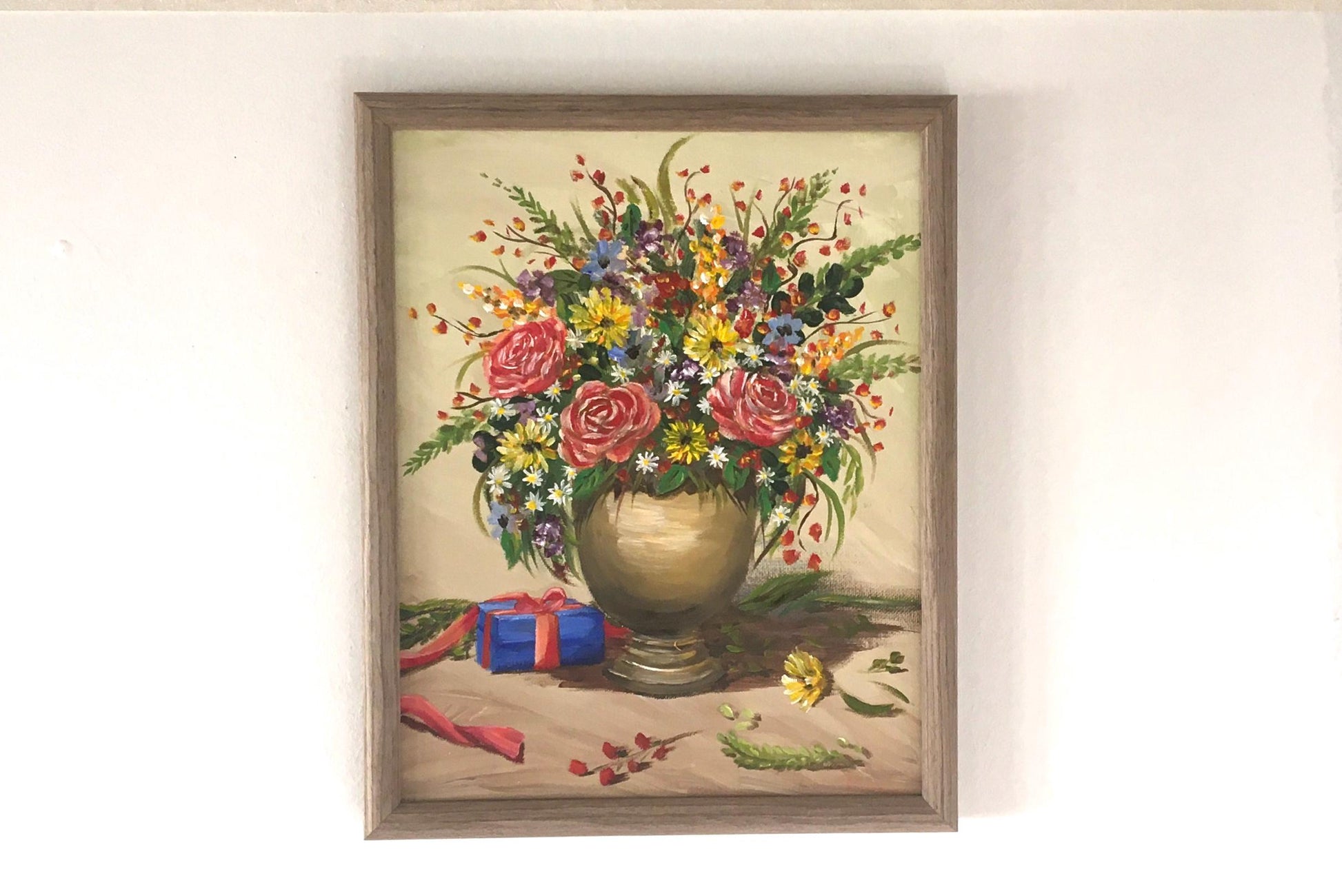 Original oil painting colorful flowers in a vase art ready ooak wall hanging gift