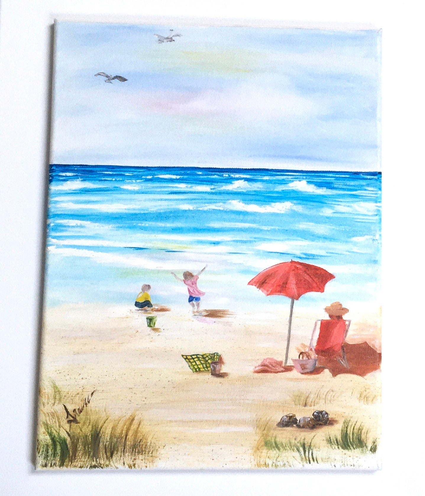 Seascape relaxing beach playing happy kids outdoor Original oil painting art wall hanging